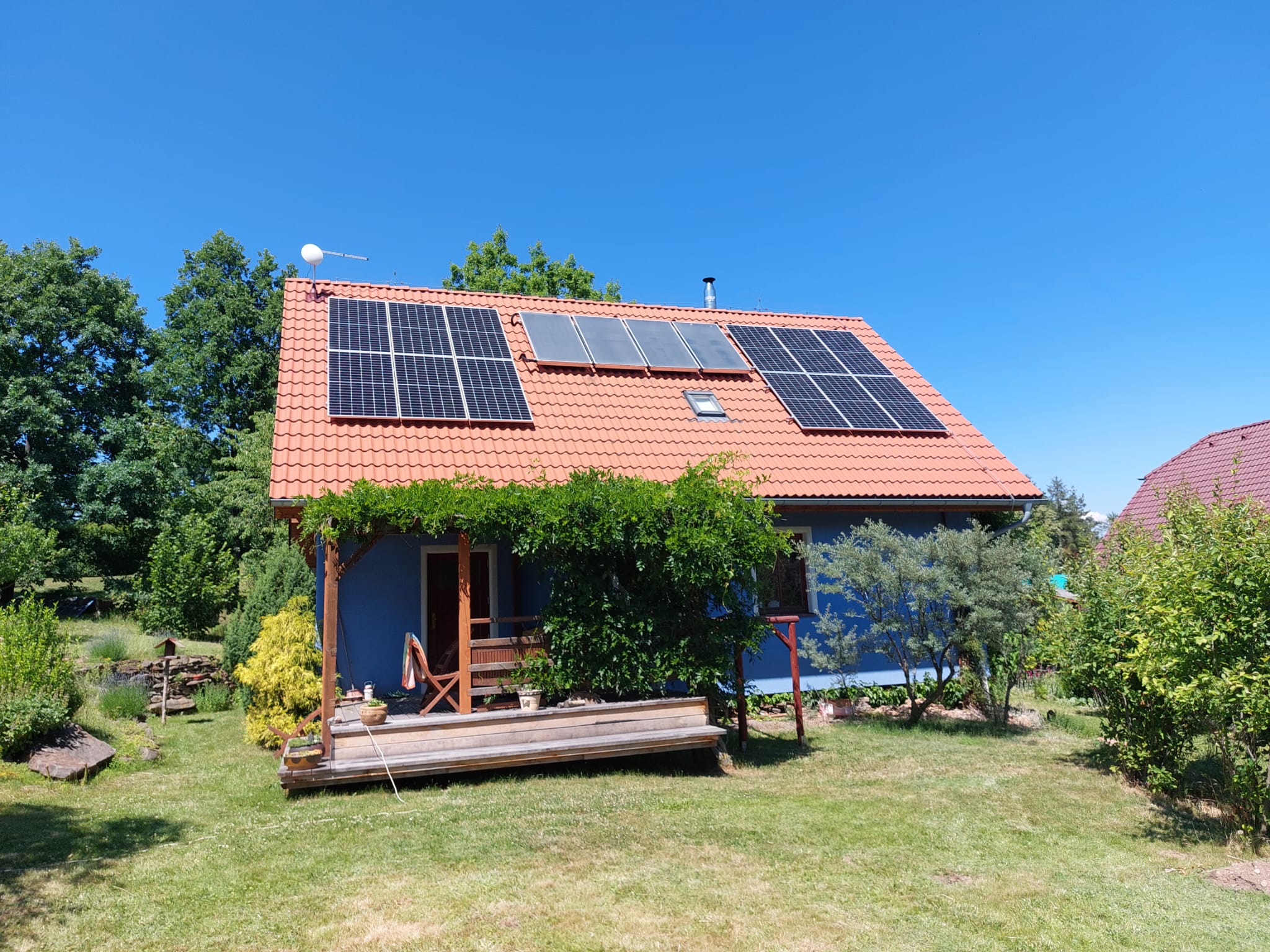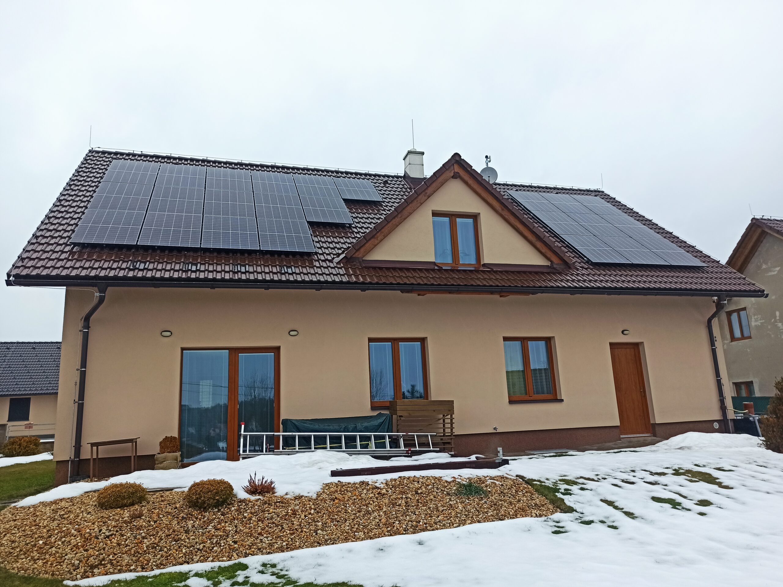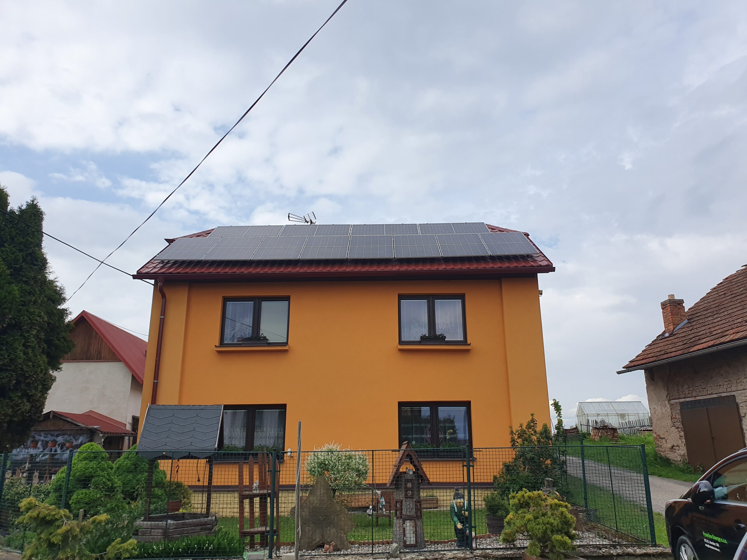Instalace FVE o výkonu 8,14kW, střídač GoodWe 10 kW baterie BYD 11 kW. Instalace pro snížení elektrické spotřeby domu včetně všech dodávek, projektové dokumentace a zpracování žádosti na NZU na klíč.