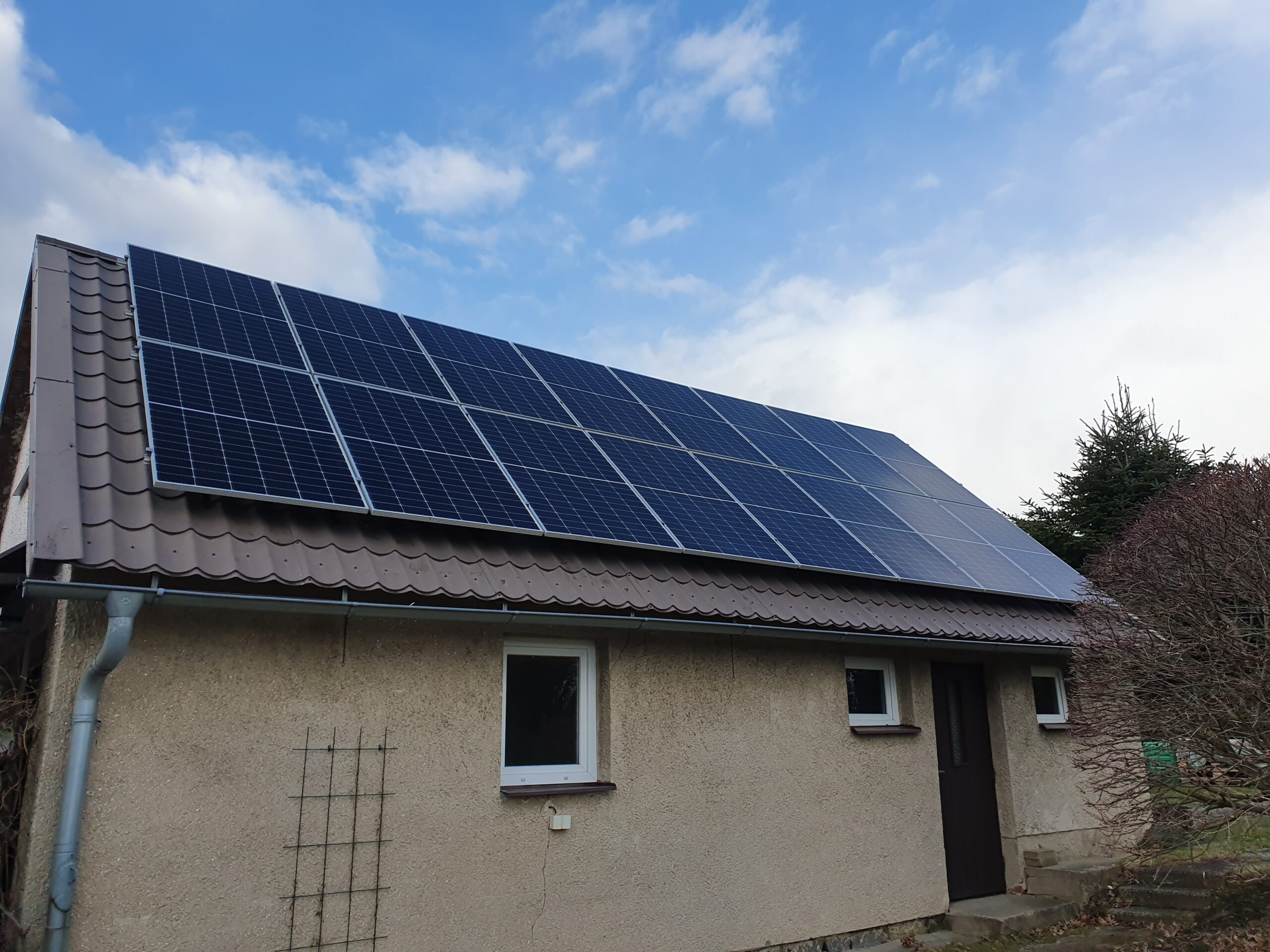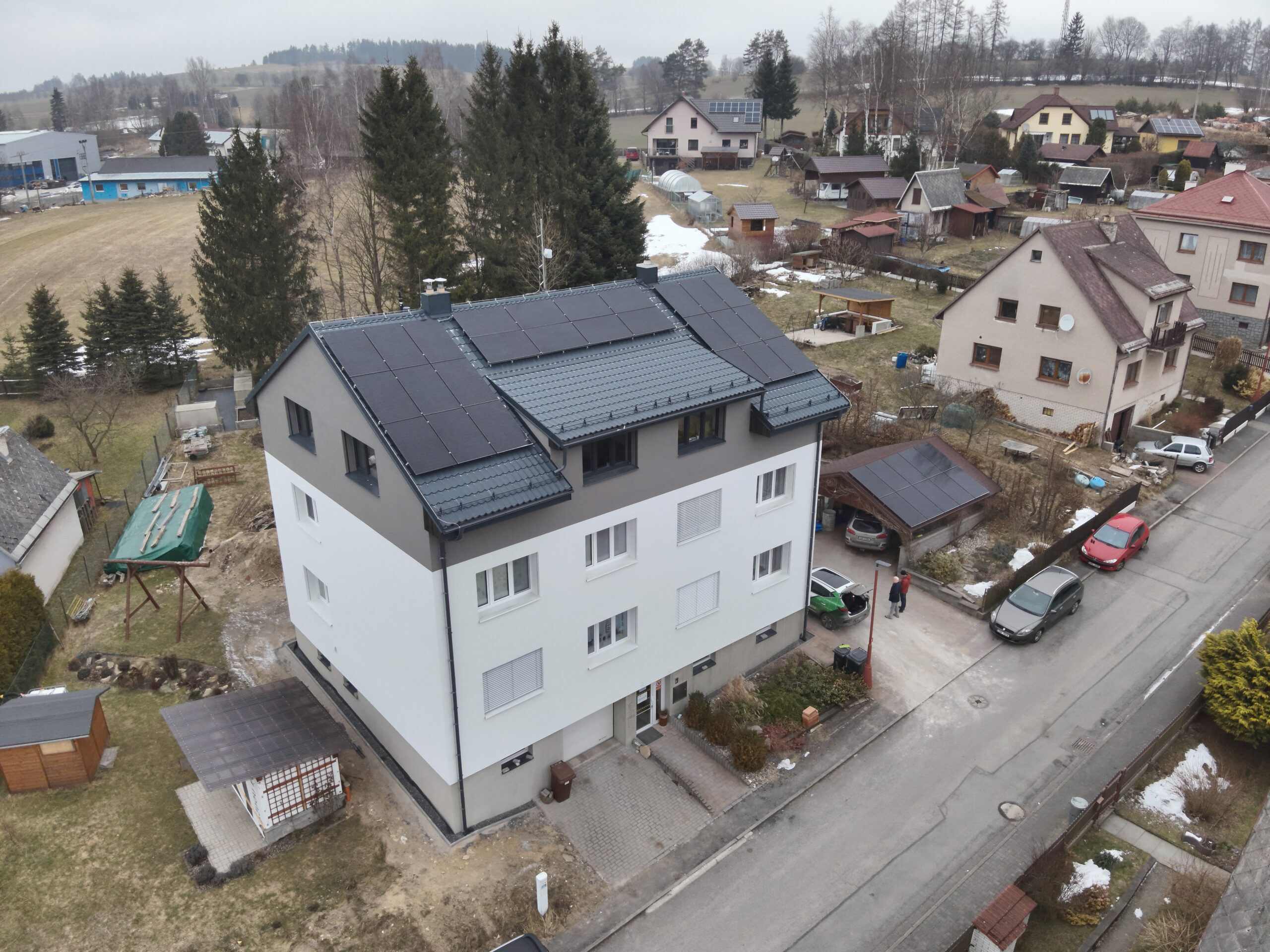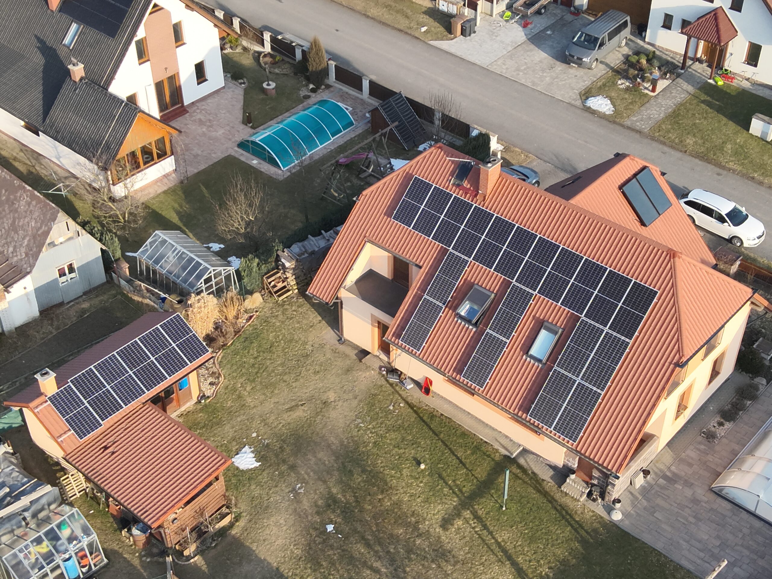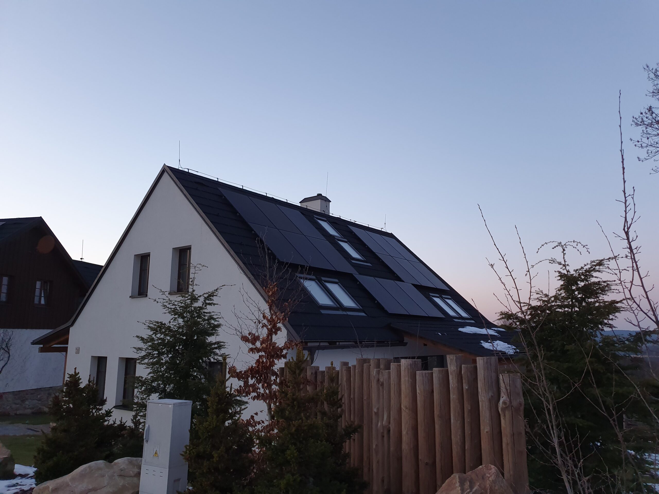 Instalace FVE o výkonu 8,14kW, střídač GoodWe 10 kW baterie BYD 11 kW. Instalace pro snížení elektrické spotřeby domu včetně všech dodávek, projektové dokumentace a zpracování žádosti na NZU na klíč.