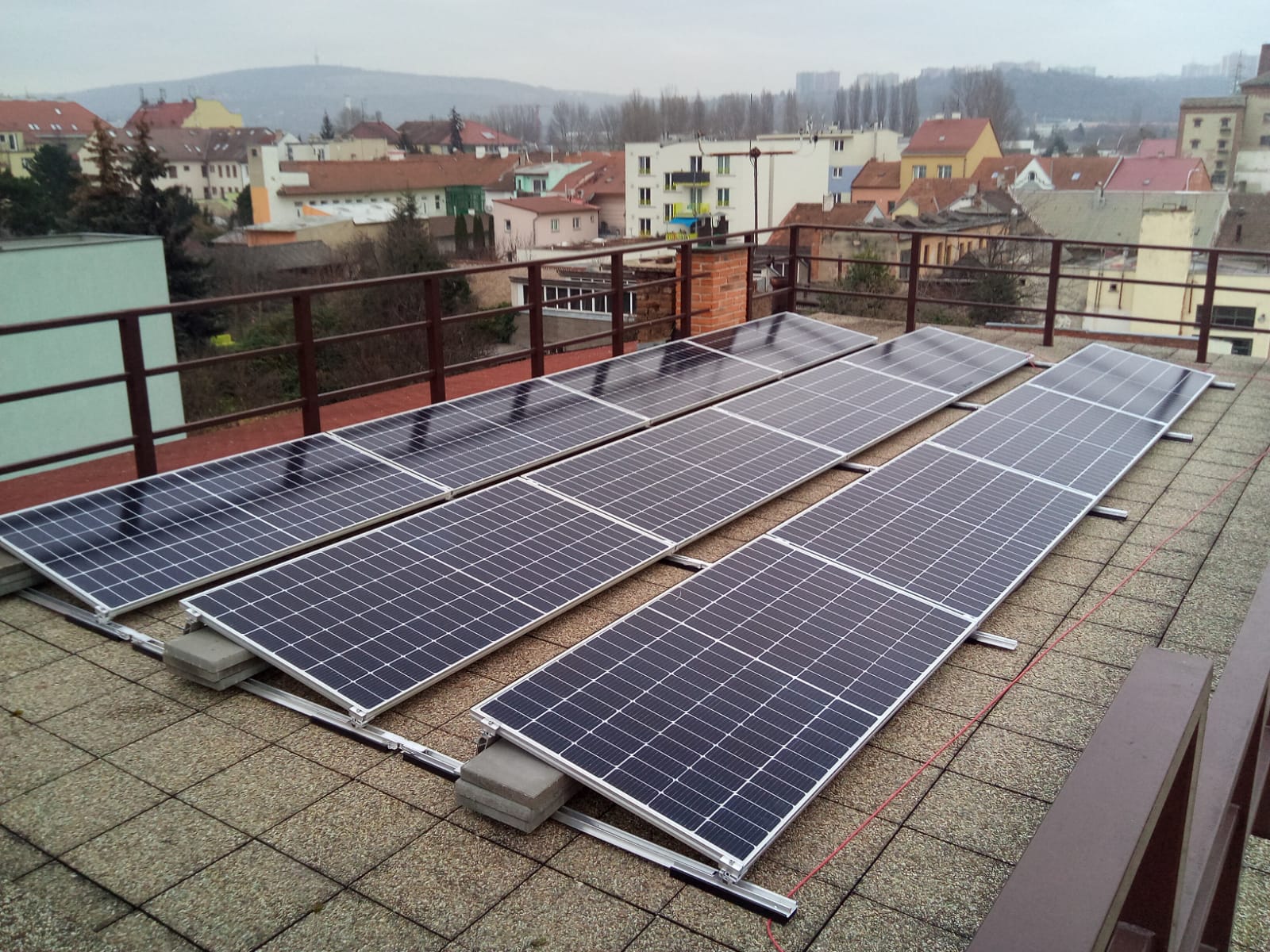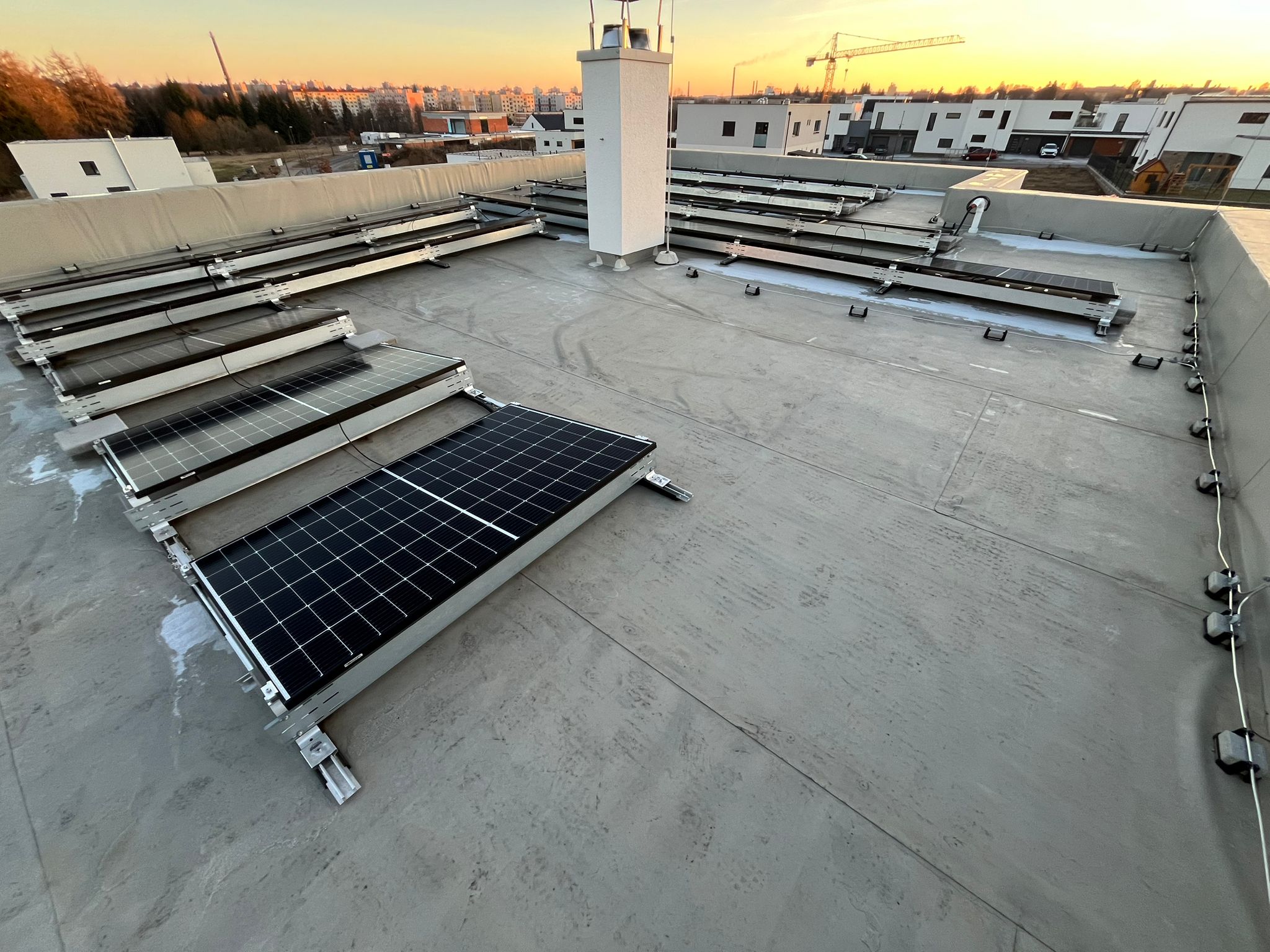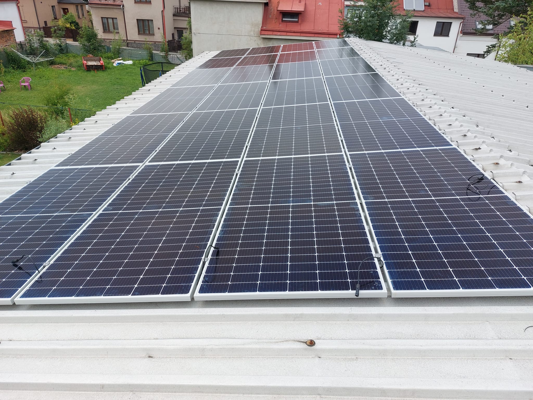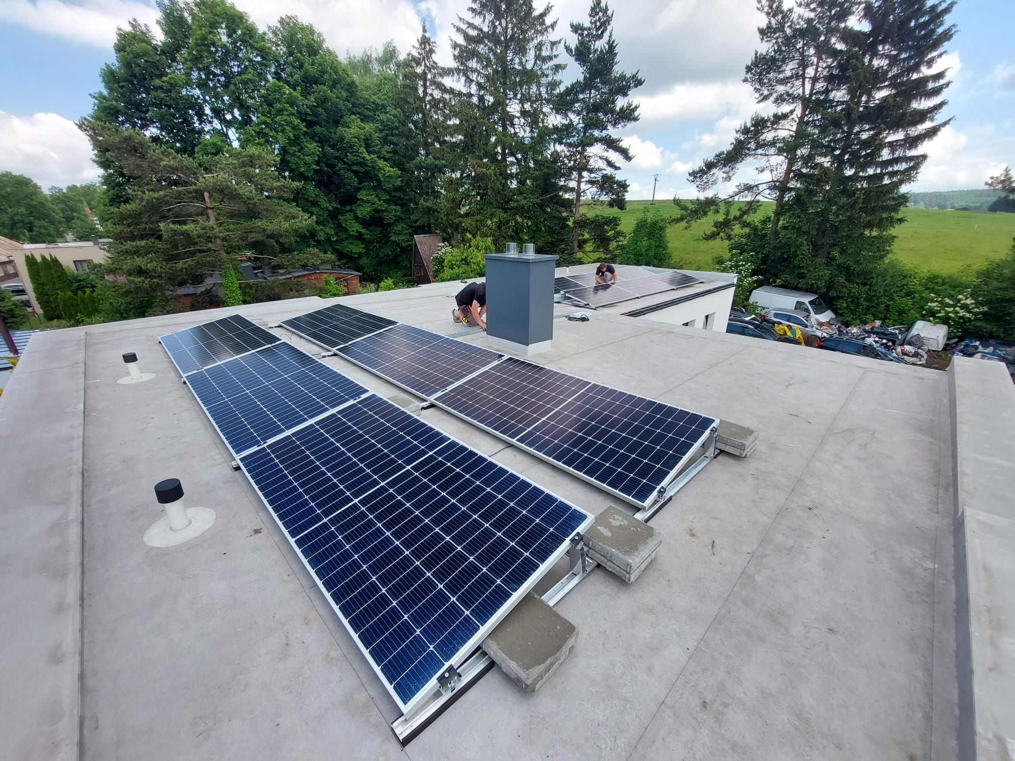 Instalace FVE elektrárny na střechu výrobní haly firmy Technomont. Instalace pokrývá část spotřeby el. energie zámečnické dilny pana Hanuse.